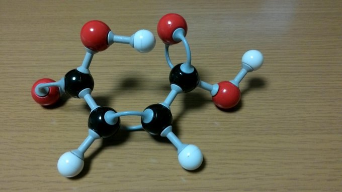 分子模型bot على تويتر フマル酸 Trans型 マレイン酸と幾何異性体 4箇所で他の分子と水素結合を形成できるので融点はマレイン酸 よりも高い マレイン酸は分子内で1つ形成して2つしか分子外で水素結合できない Http T Co Askerathrp