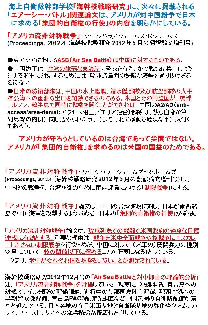 伊波 洋一 いは よういち On Twitter 海幹校戦略研究 のエアシー バトル関連論文 アメリカ流非対称戦争 は南西諸島への自衛隊有事部隊配備と 集団的自衛権の行使 を提起 台湾の脆弱な東海岸を中国海軍から守るために琉球列島で自衛隊が地対艦ミサイルで中国
